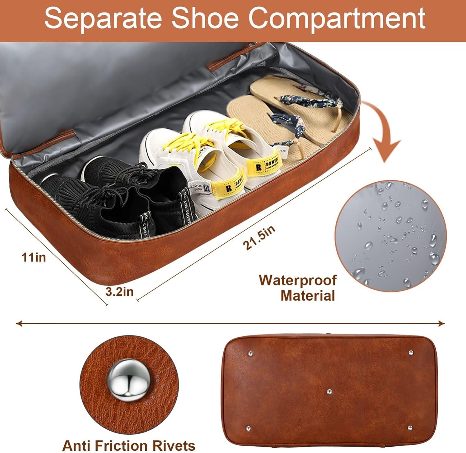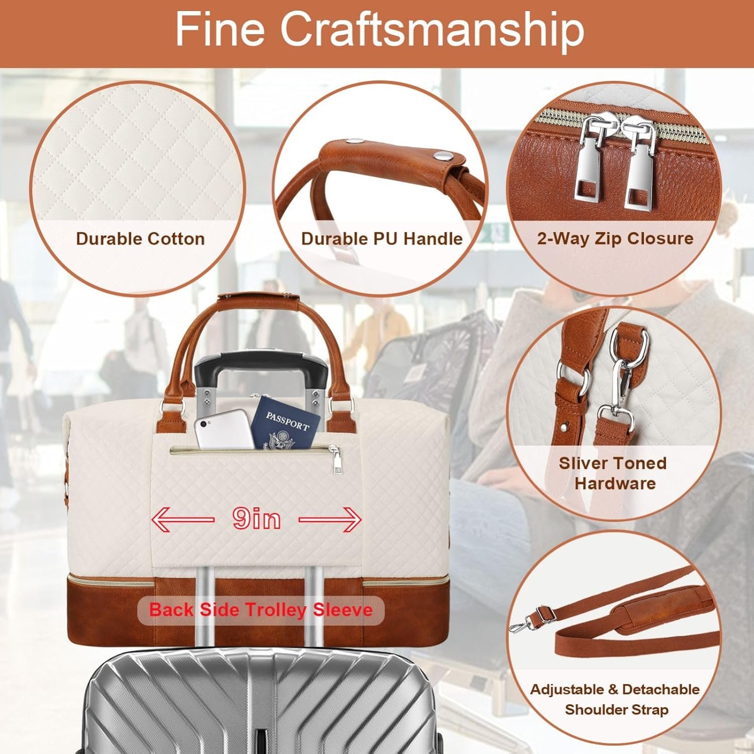The interior of the womens travel bag is spacious and well-organized, with multiple compartments and pockets that allow you to store your belongings in a neat and orderly manner. The main compartment is roomy enough to hold all your clothing and toiletries, while the smaller pockets are perfect for storing items like your phone, wallet, and passport. The travel tote bag also features a separate shoe compartment that keeps your shoes away from your clothes, ensuring that everything stays clean and tidy.