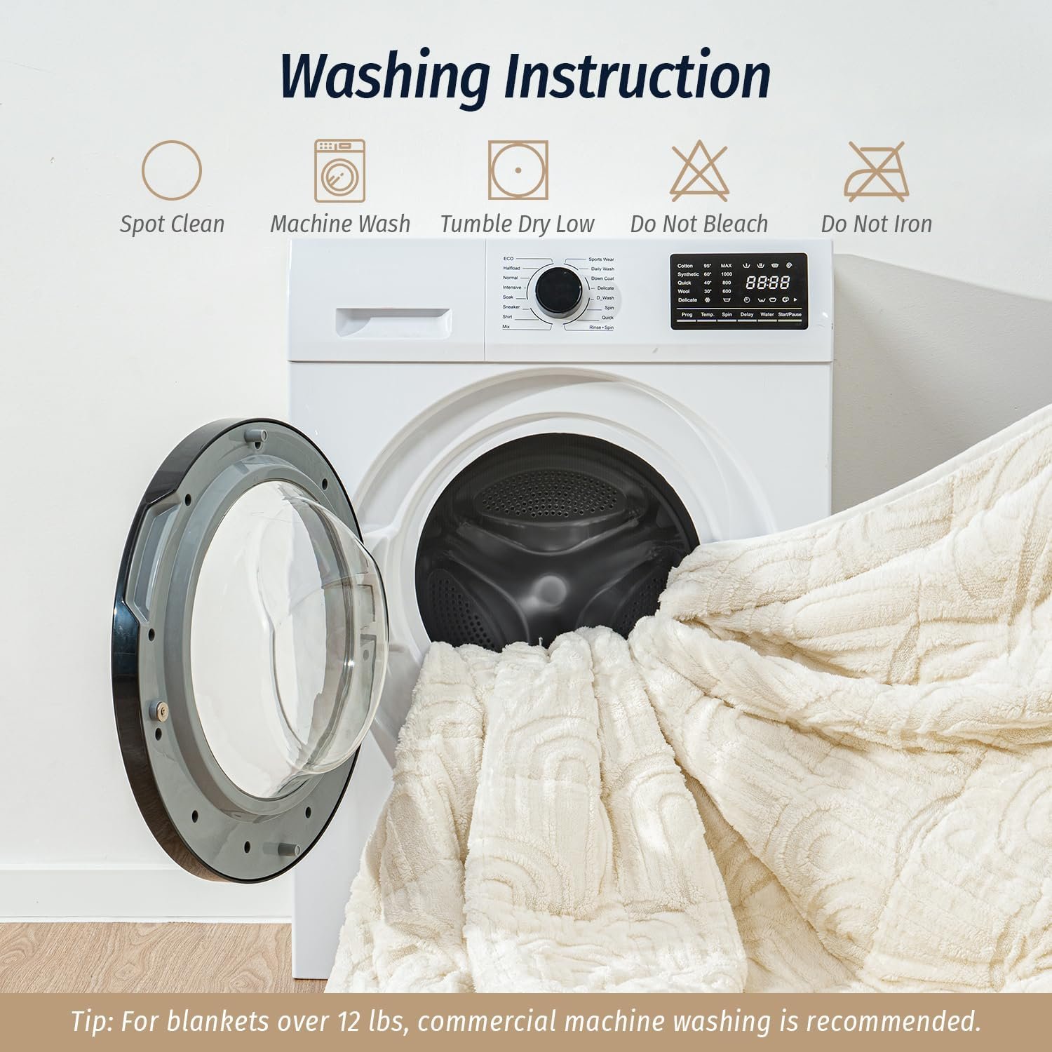 Care Tips: We recommend spot cleaning small stains. You can also machine wash it in cold water on a gentle cycle and tumble dry on low. For blankets over 12 lbs, a commercial washing machine is recommended