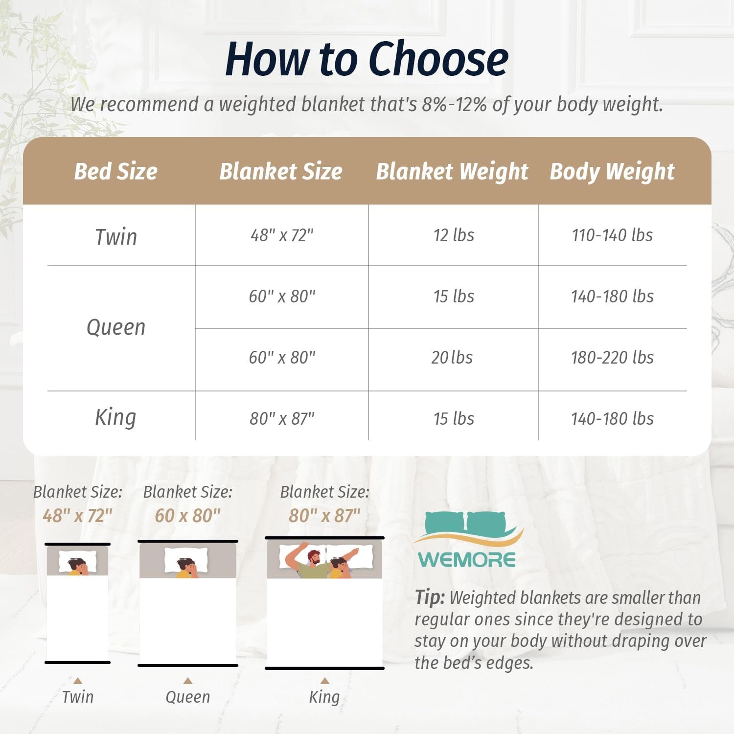 Size & Weight Guide: We recommend choosing a weigted blanket that’s about 8–12% of your body weight. If you’re new to weighted blankets, start with a lighter option. It typically takes 3–5 days to adjust and fully enjoy its benefits
