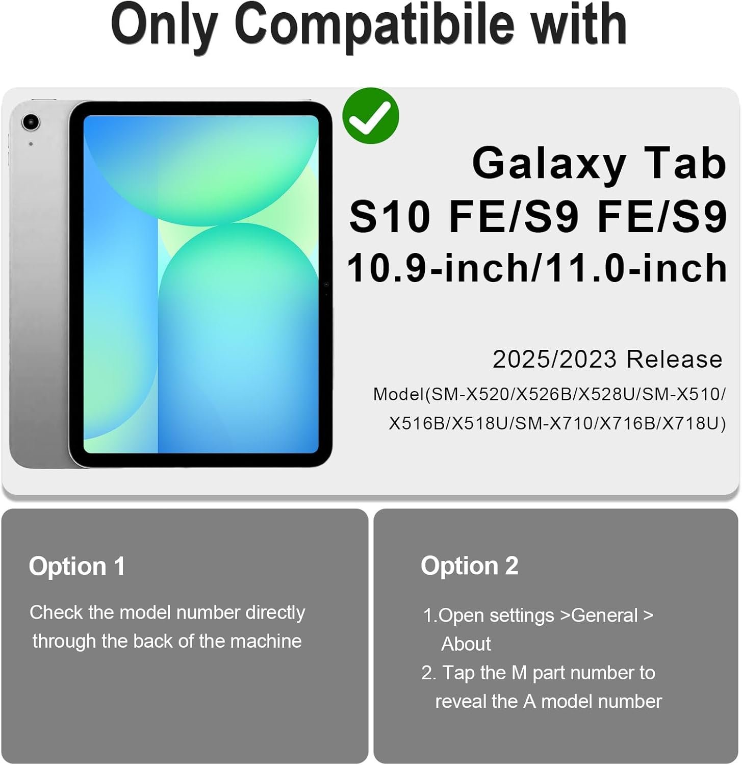 COMPATIBILITY:ONLY for Samsung Galaxy Tab S10 FE 10.9 Inch 2025 (SM-X520/X526B/X528U) ; Samsung Galaxy Tab S9 FE 10.9 Inch 2023 (SM-X510/X516B/X518U) ; Samsung Galaxy Tab S9 11 inch 2023 (SM-X710/X716B/X718U).Please check your tablet to avoid the incorrect model number.