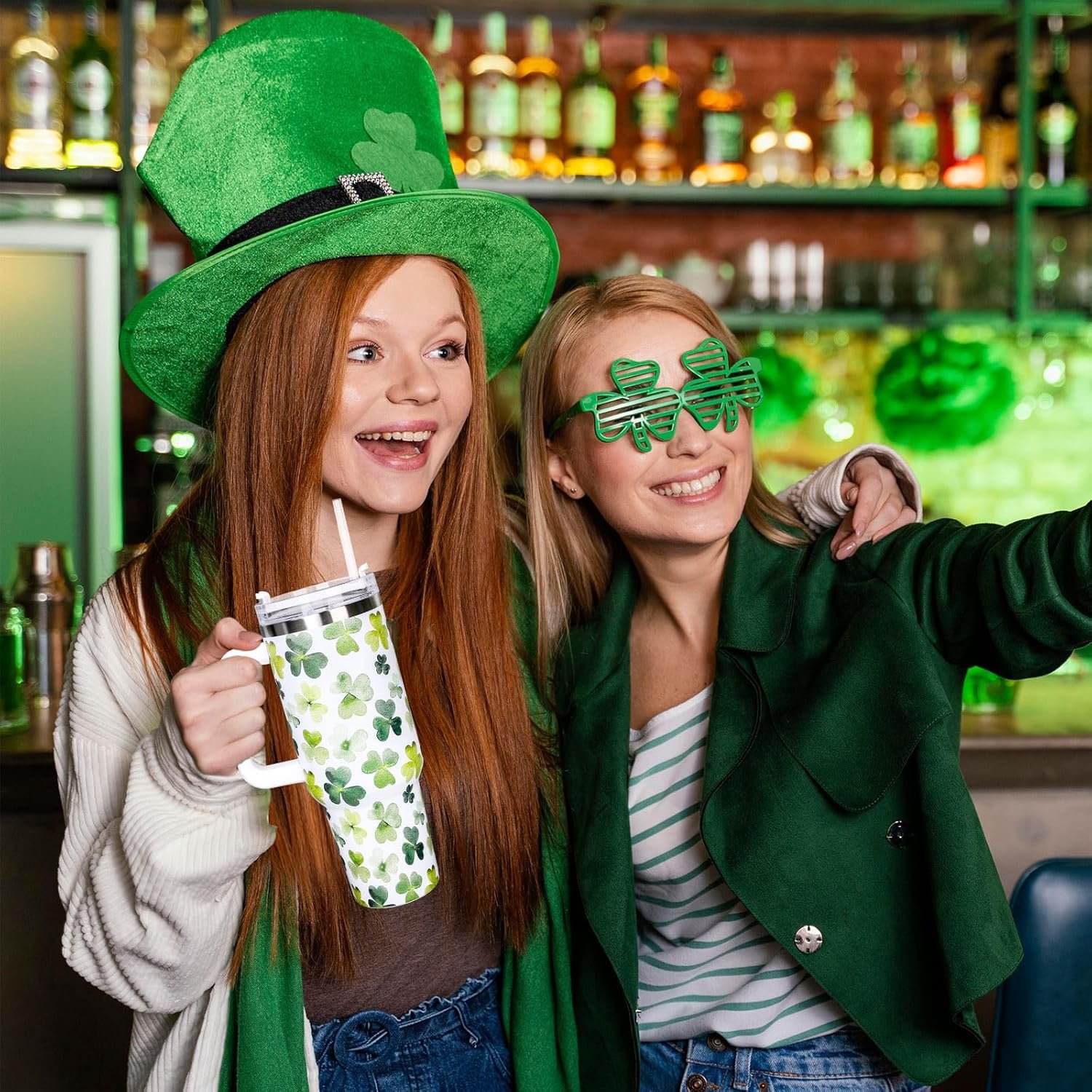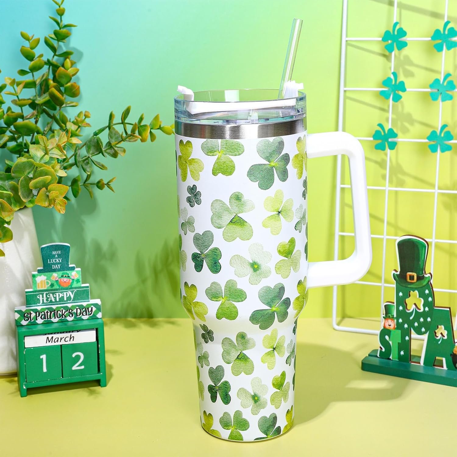Delicate Design: Featuring a theme of St. Patrick’s Day with watercolor shamrock patterns against a white background, vibrant and lively, which is a great addition to your home and party