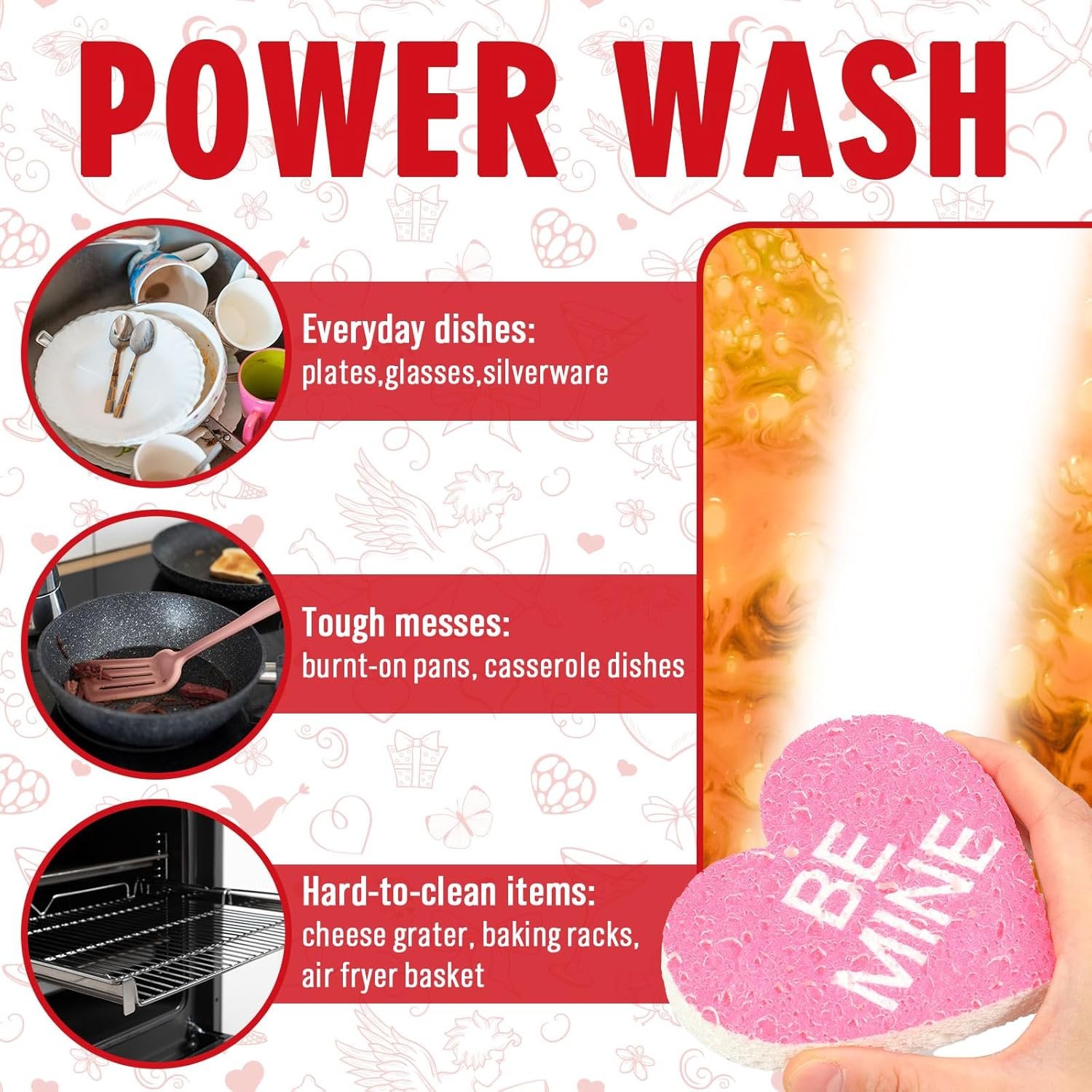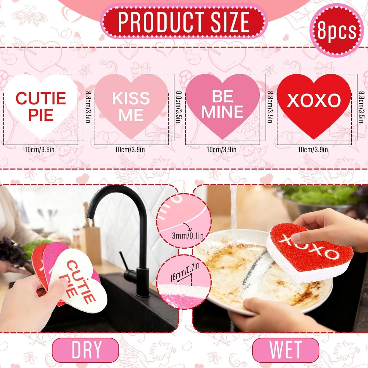 Heart Design: Our dish sponges are shaped in heart with sweet love sayings, colored in red, pink and white, look adorable and playful, which is a good helper for home and kitchen