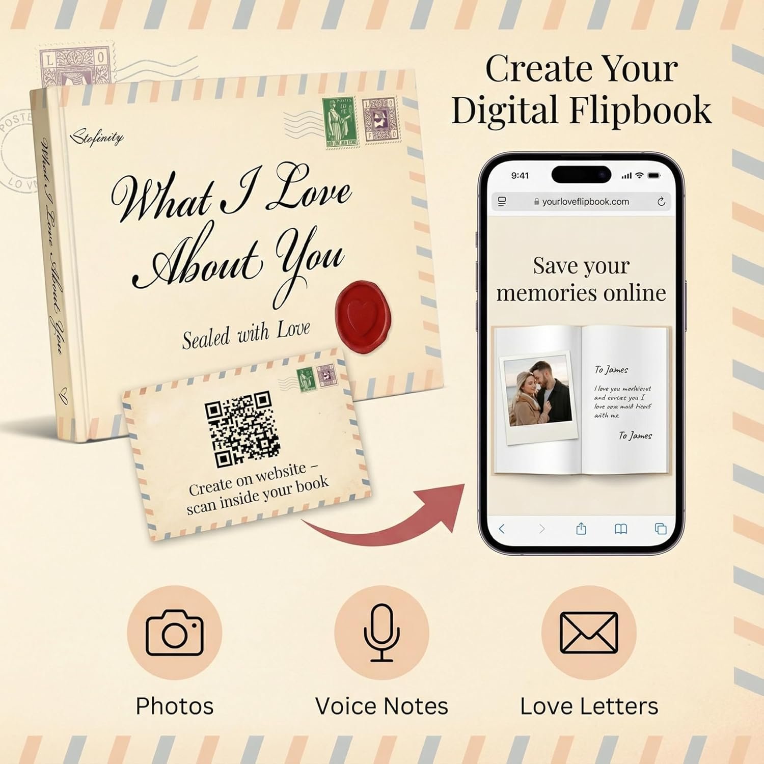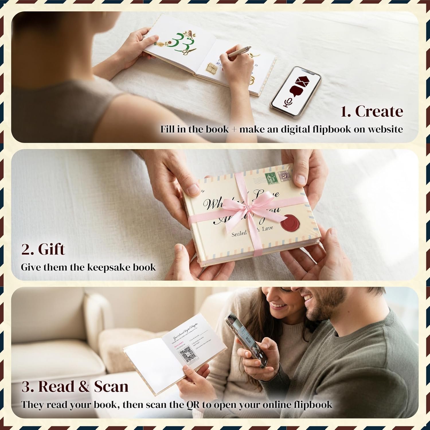 HOW IT WORKS: Complete the prompts in the physical book, then scan the code to create your digital flipbook on our website-no account or app required. When they receive the romantic gifts, they can enjoy your handwritten pages and scan the same code to view the extra photos, letters, and voice notes online.