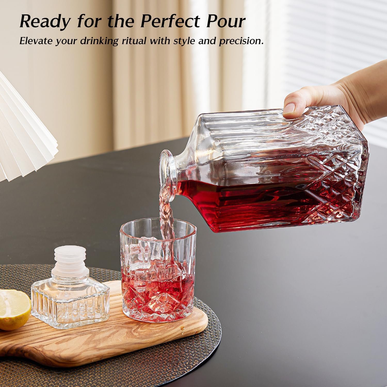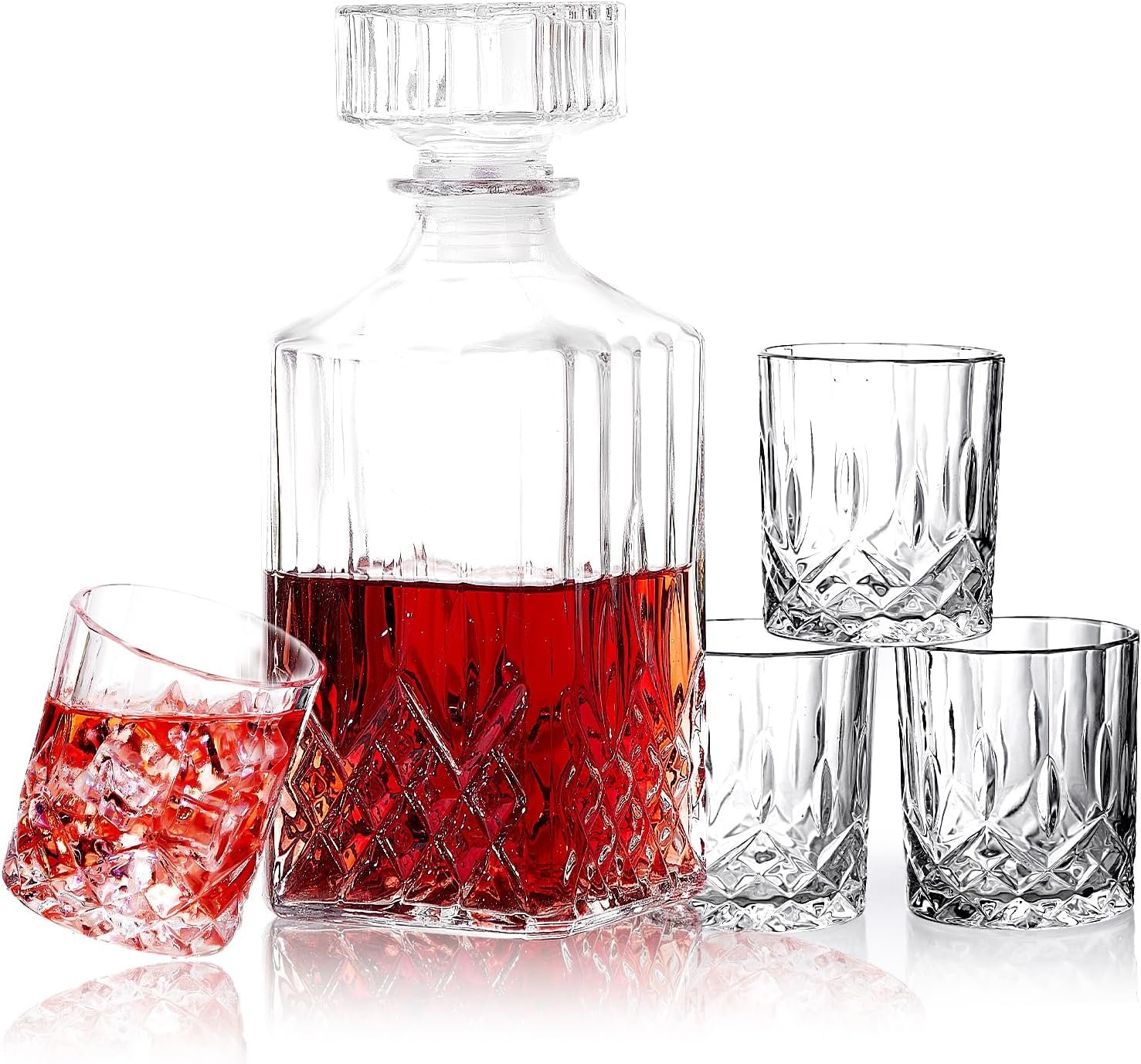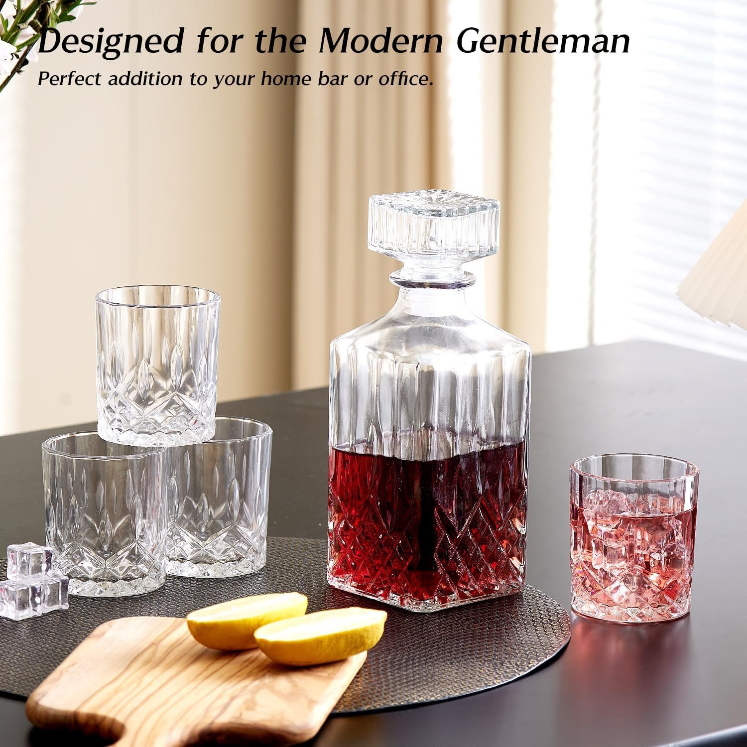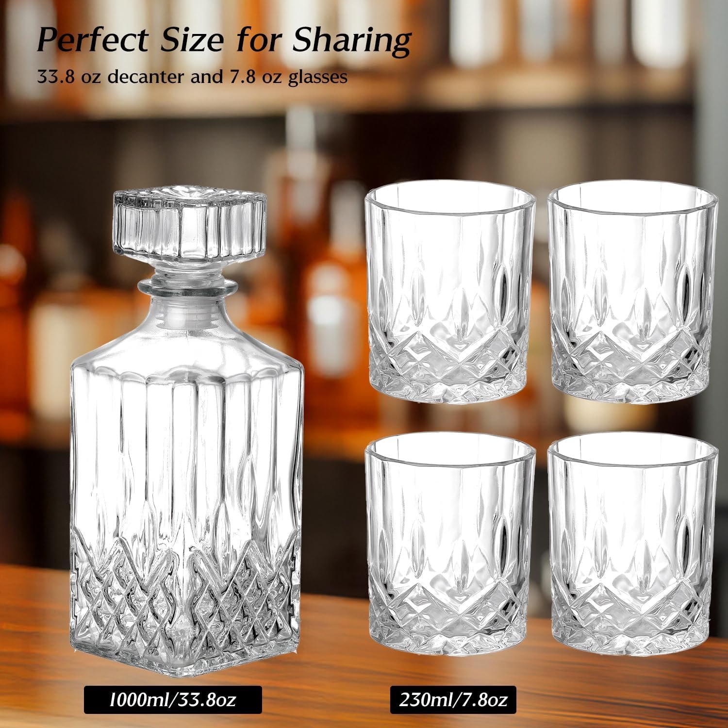 Complete Whiskey Decanter Set – This 5-piece set includes a 33.8 oz (1000ml) whiskey decanter and four 7.8 oz (230ml) whiskey glasses, perfect for enjoying bourbon, scotch, or whisky with friends or guests.