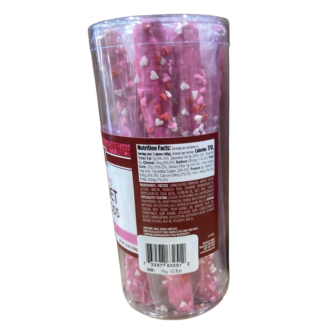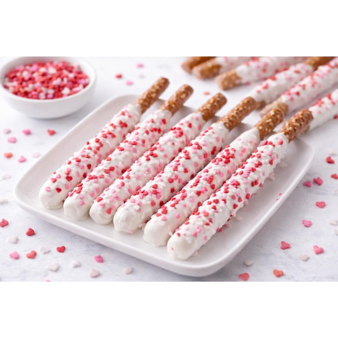 This tub of White Chocolatey Coated Pretzel Rods includes eight pretzel rods covered in a smooth white chocolatey coating and finished with heart-shaped confetti sprinkles. Each rod offers a crisp pretzel crunch paired with a creamy, sweet coating and a light sprinkle texture for a balanced bite. The tub keeps the pretzel rods neatly contained and works well for candy bowls, dessert tables, or seasonal displays.