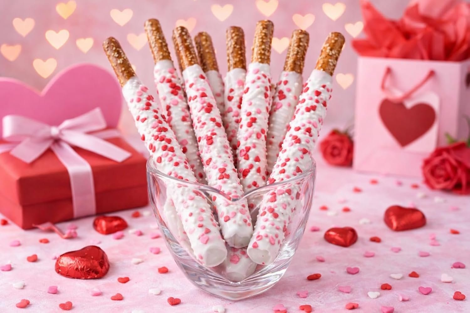 Includes eight white chocolatey coated pretzel rods topped with heart confetti