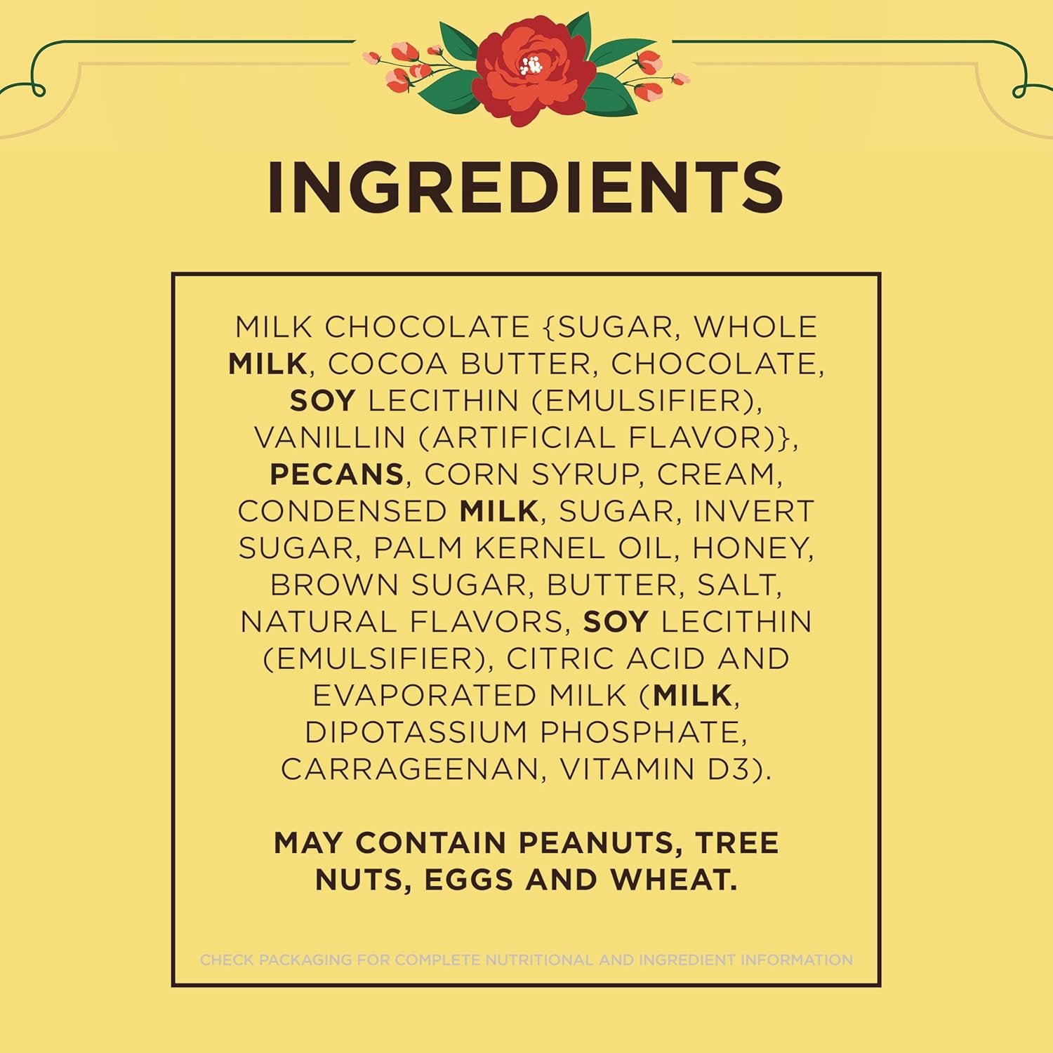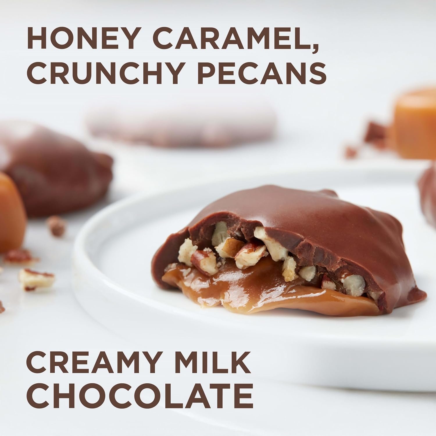 9 generous pieces of sweet, honey caramel with pecans dipped in delicious milk chocolate. Product sold by weight, not volume. Information online not complete, check label of actual product being purchased.