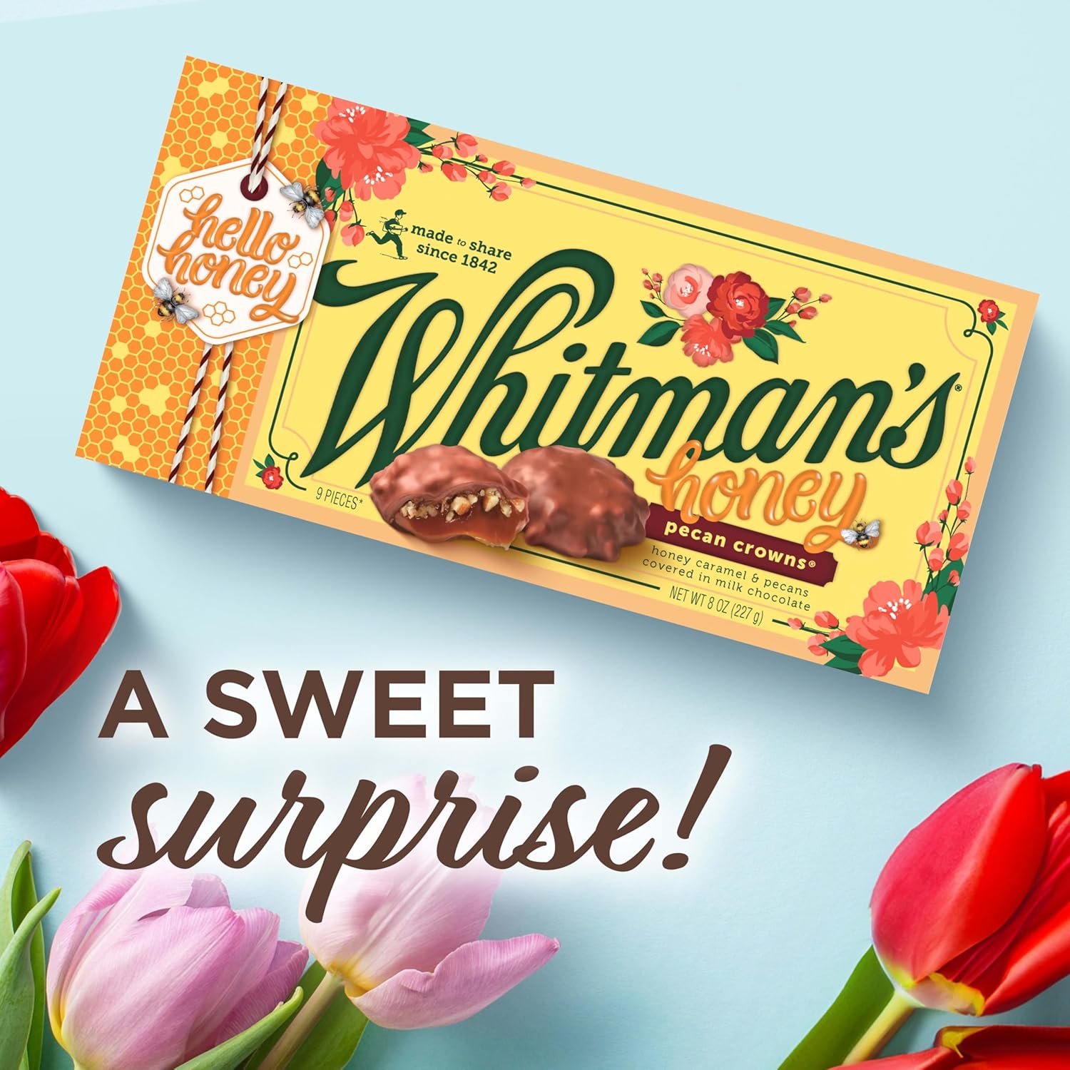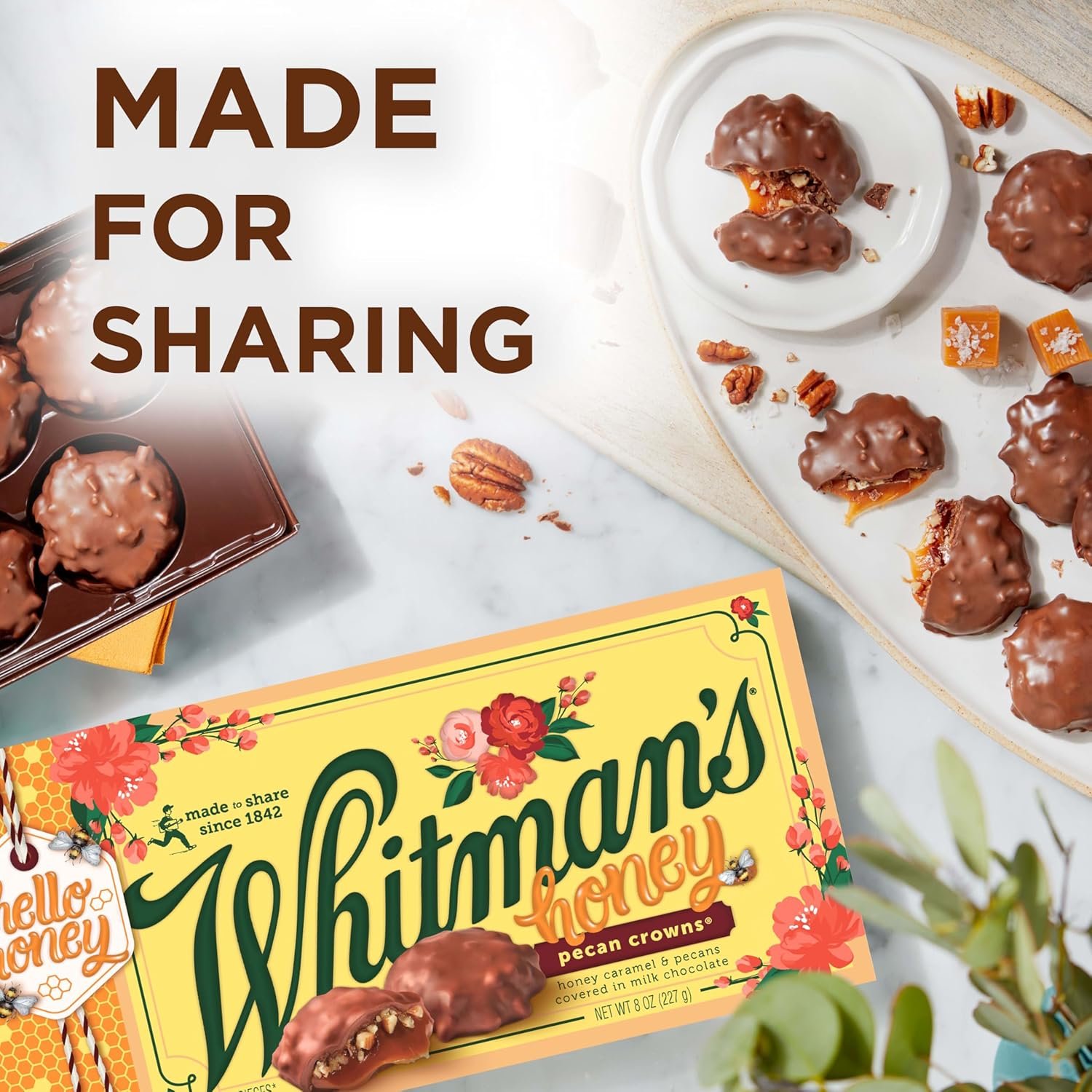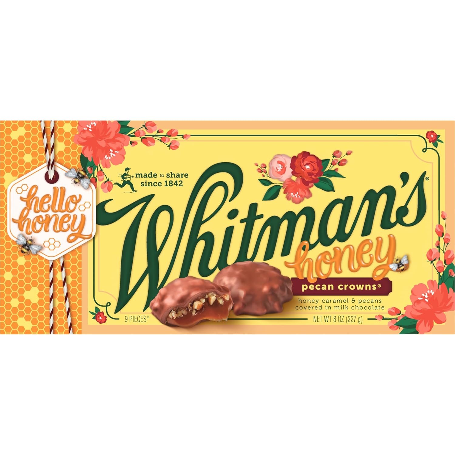 WHITMAN’S Honey Pecan Crowns Gift Box, 8 oz. We’ve taken our most popular bite and made it even better! Our new honey caramel pecan crowns are filled with rich, honey-infused caramel and crunchy pecan pieces, all covered in delicious milk chocolate. Share our new pecan crowns for every celebration or occasion! I Love You, Thank You, Anniversary Gift, Congratulations or Just Because. Since 1842, Americans have been making connections and enjoying sweet, quality moments with Whitman’s chocolate. We are proud to have been shared and savored by generations.