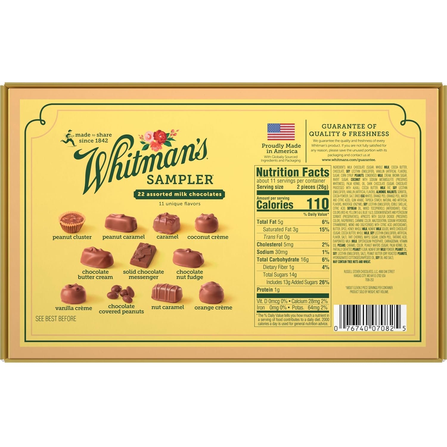 WHITMAN’S SAMPLER Assorted Milk Chocolate Candy Gift Box, 10 oz., makes a perfect gift for friends or family! Our 22 piece assortment of 11 unique flavors features: milk chocolate peanut cluster, milk chocolate peanut caramel, milk chocolate caramel, milk chocolate coconut crème, milk chocolate butter cream, solid milk chocolate messenger, milk chocolate nut fudge, milk chocolate vanilla crème, milk chocolate covered peanuts, milk chocolate nut caramel and milk chocolate orange crème. WHITMAN’S SAMPLER assorted chocolates is the perfect gift for every celebration or occasion! Since 1842, Americans have been making connections, and enjoying sweet, quality holiday moments with Whitman’s chocolate. We are proud to have been shared and savored by generations.