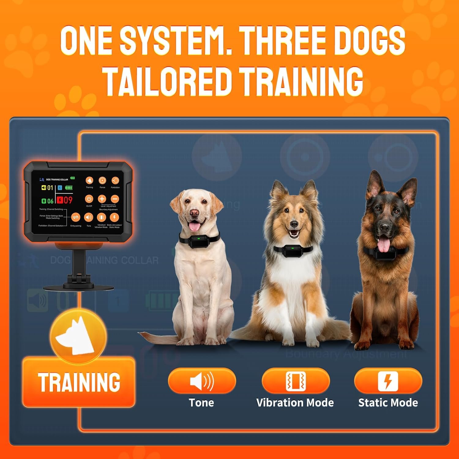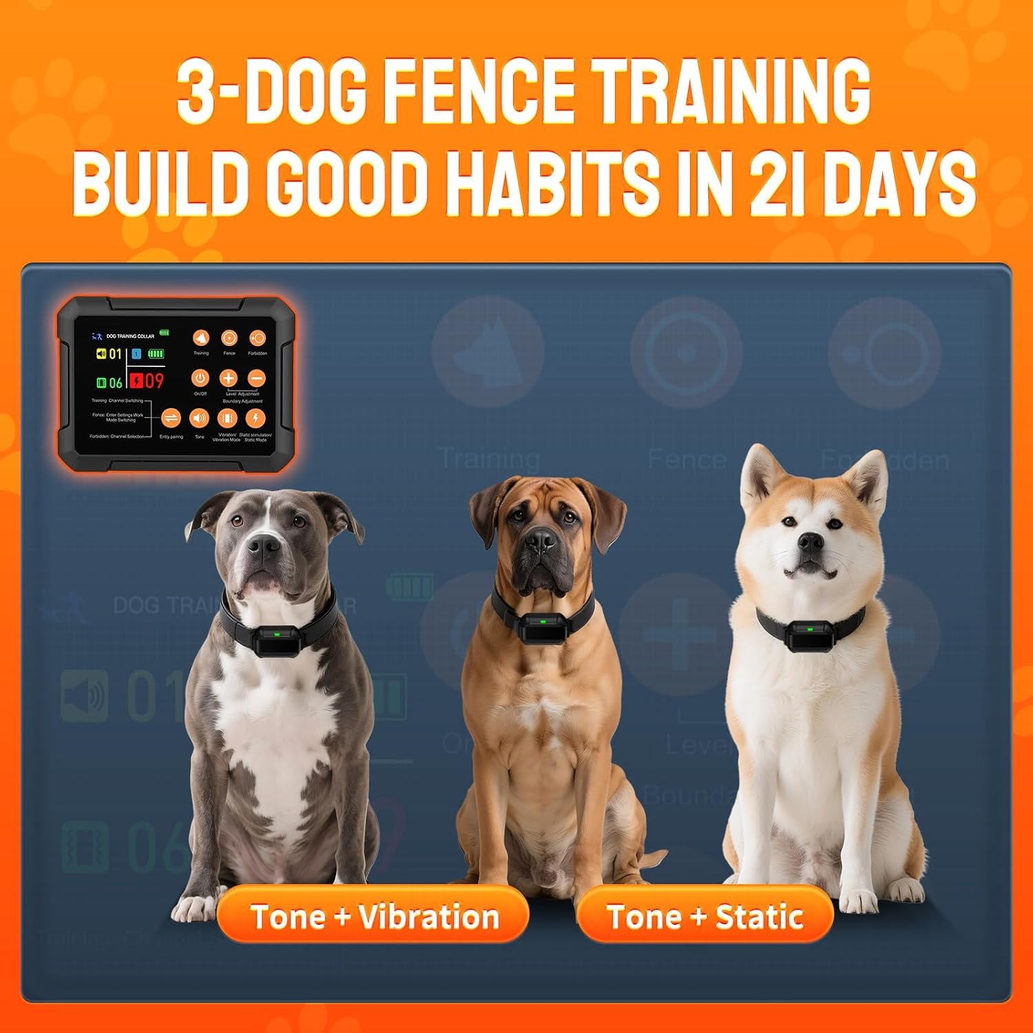 【No Dig Fence, Simple Pairing, Smart Setup – No Tech Skills Needed】Start by turning on the transmitter and receiver, then use Entry Pairing to connect. Choose your mode: Fence, Training, or Forbidden. Adjust training style from sound, vibration, or static—no app, no Wi-Fi, no hassle