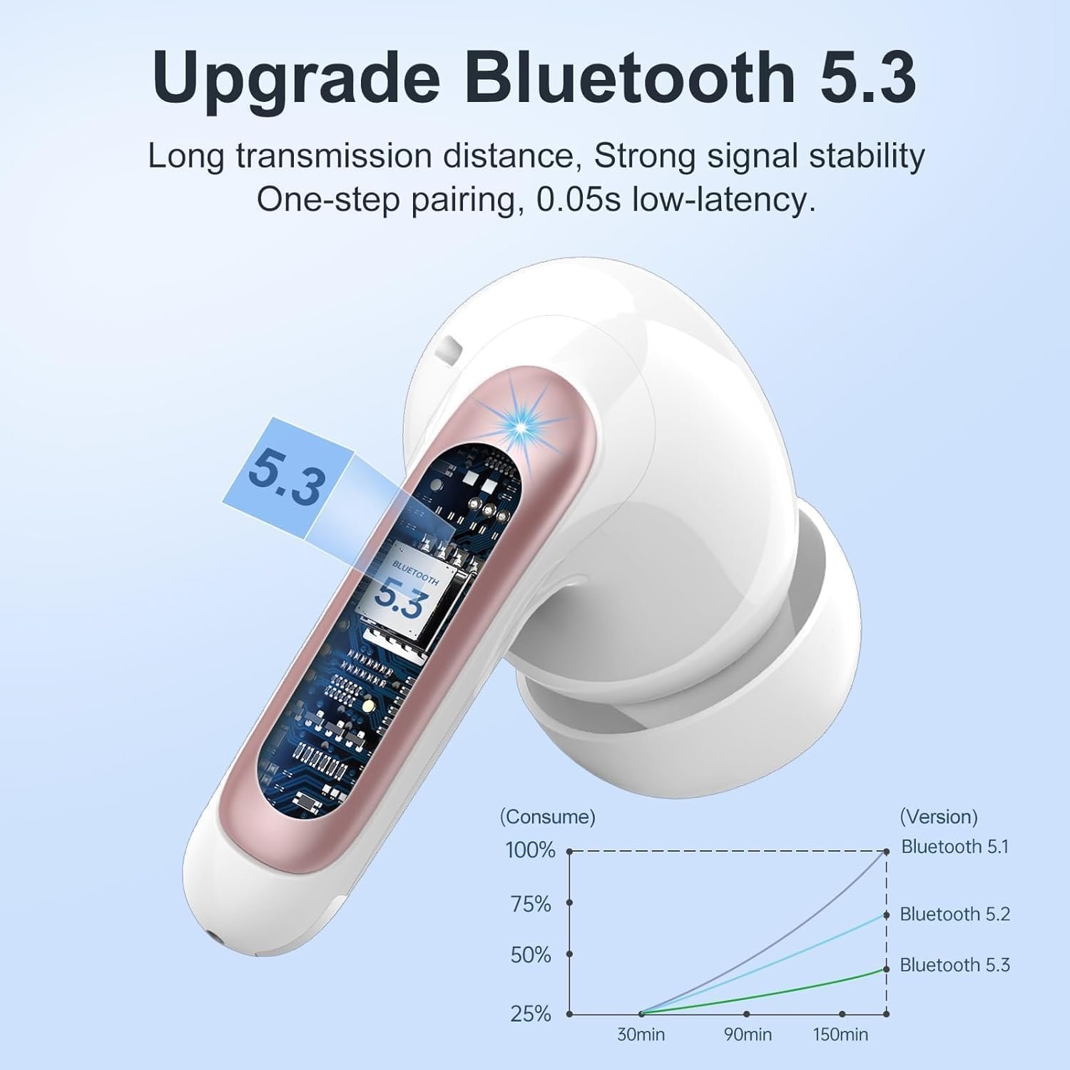 Hi-Fi Stereo and 4 ENC Noise Canceling Microphones: The headphones noise canceling uses a 4-microphone design and ENC technology to accurately capture the human voice during a call, and can suppress 90% of the interfering background noise in the call environment, bringing deep bass and Hi-Fi stereo, allowing the other party to hear your voice more clearly.