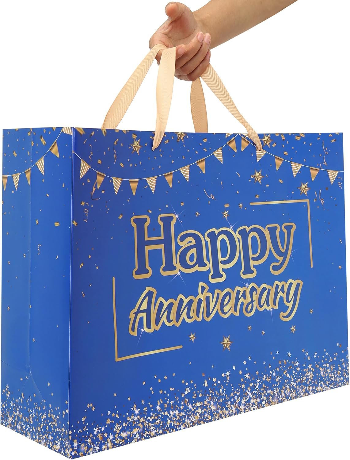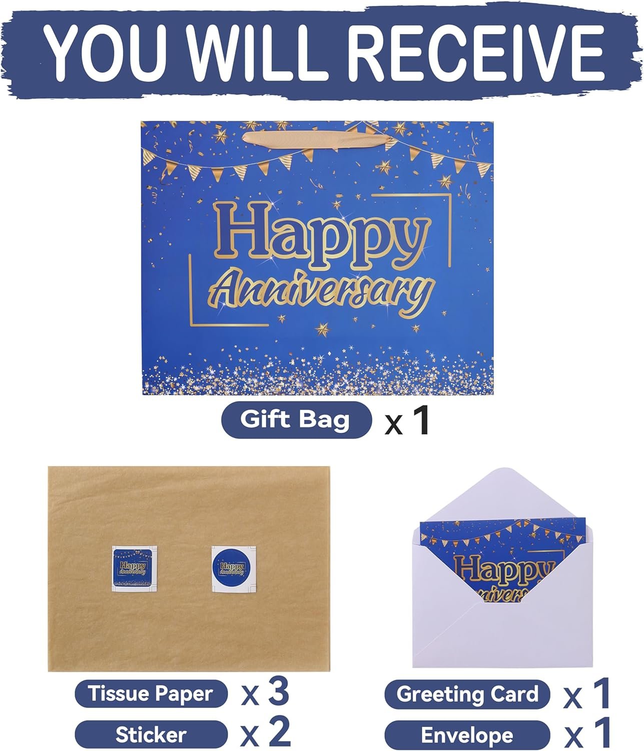 ULTIMATE SET FOR EASY GIFT GIVING: You will receive 1 extra large gift bag, accompanied by 3 sheets of blue tissue paper for effortless wrapping or decoration. Additionally, you’ll find 1 greeting card of the same design, complete with 1 accompanying envelope, providing the perfect canvas for you to express your heartfelt wishes. The included 2 stickers add a sense of ceremony to your gift-giving experience. VERSATILE USE: This adorable gift bag is guaranteed to bring joy to lover, husband, making it perfect for celebrating anniversary party, wedding and other special occasions for loved ones. PERFECT SIZE FOR SMALL & BIG GIFTS: The Sophisticated large gift bag, measuring 16.5”L x 12.6”H x 5.5”D, is the ideal size for accommodating a variety of items. It can hold electronic devices, home decor items, high-quality chocolates, gourmet gift baskets, stylish clothing, designer handbags, fashionable accessories, thought-provoking books, bestselling novels, and much more. ECO FRIENDLY AND HIGH-QUALITY: Expertly crafted from premium paper materials, these eco-friendly gift bags are not only stylish but also sustainable. Designed to support up to 10 pounds, they are made with paper sourced from responsibly managed forests, ensuring their environmental friendliness.