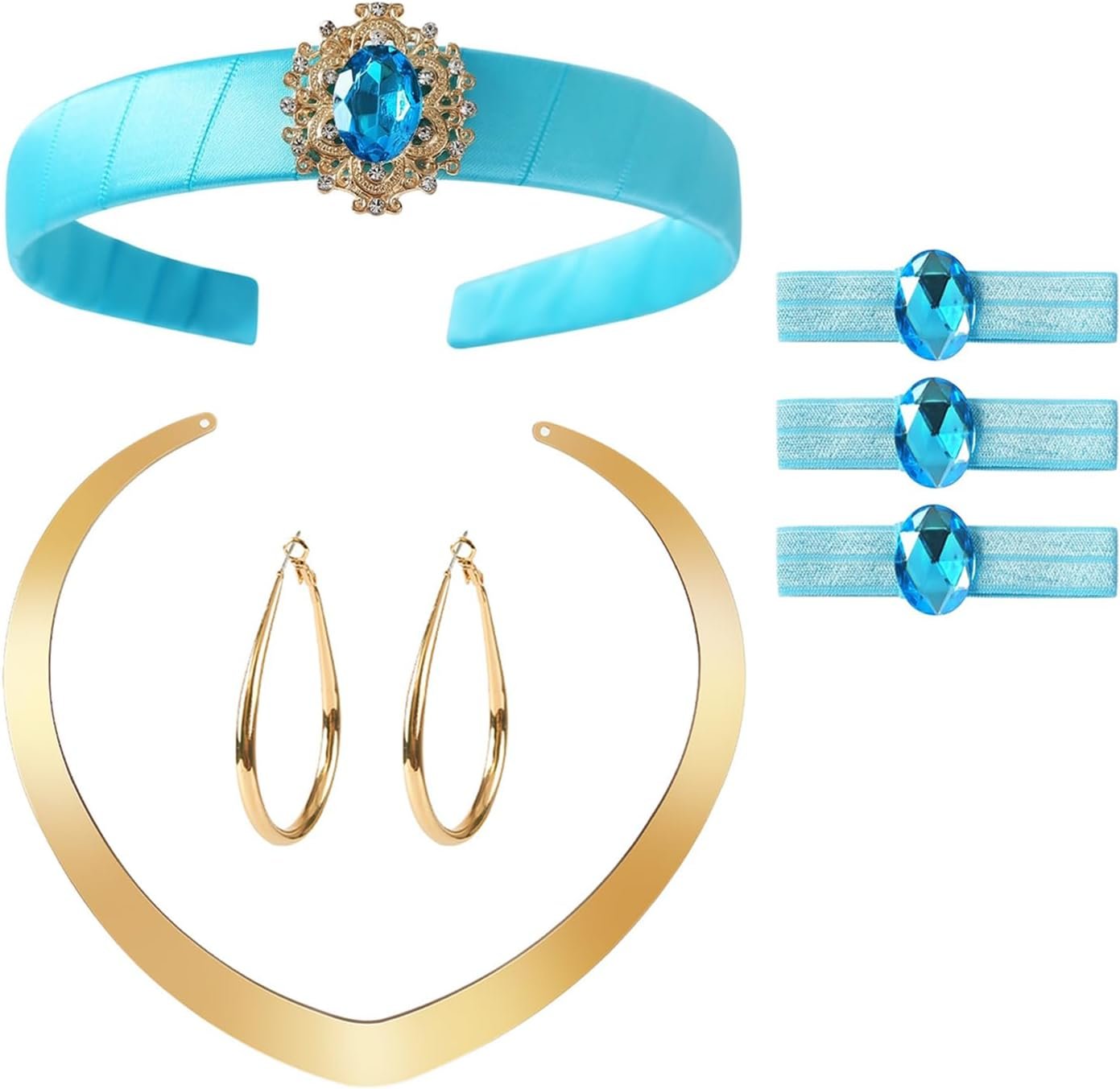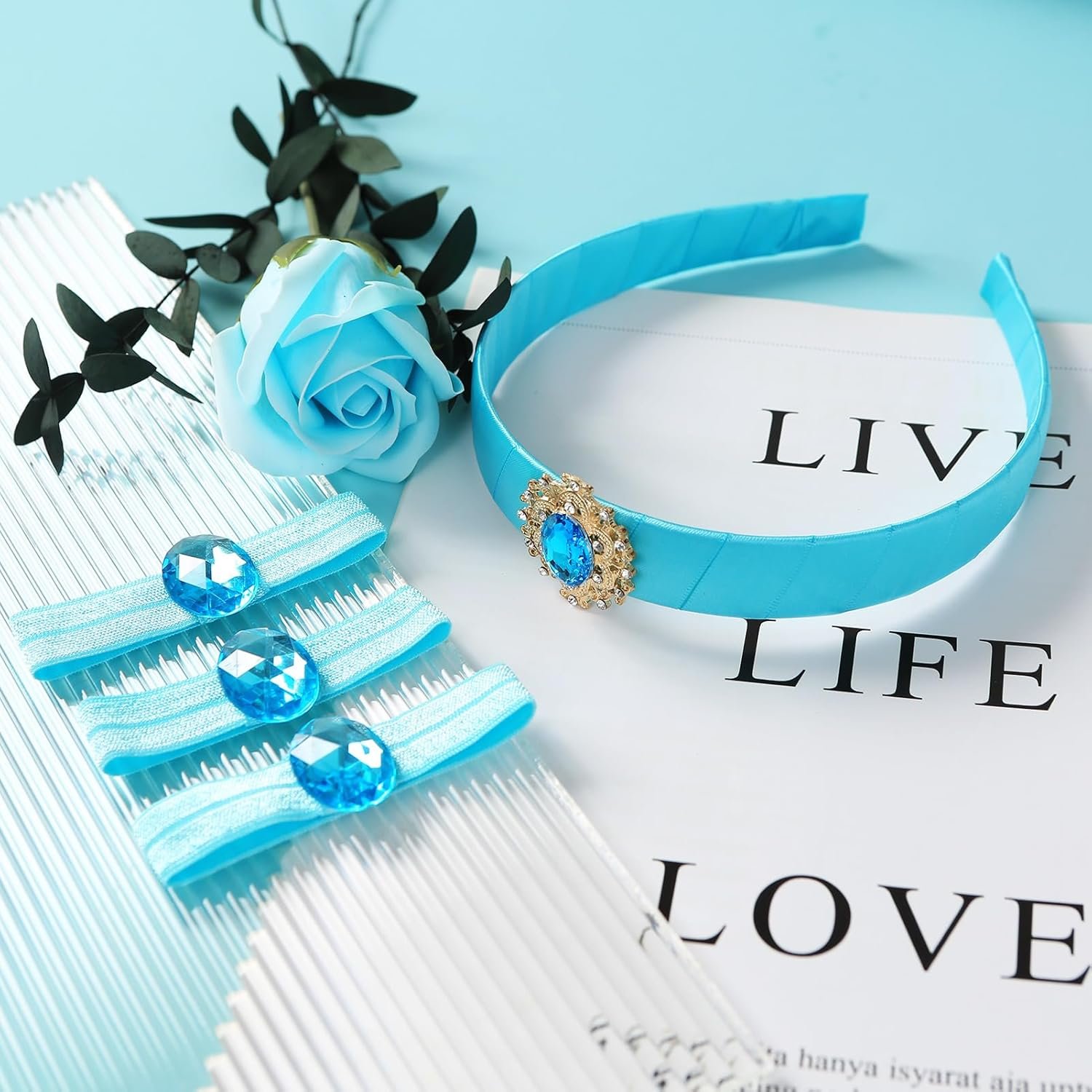 Package Includes: 1 x blue gem headband, 1 x necklace, 1 x earrings, 3 x hair ties.