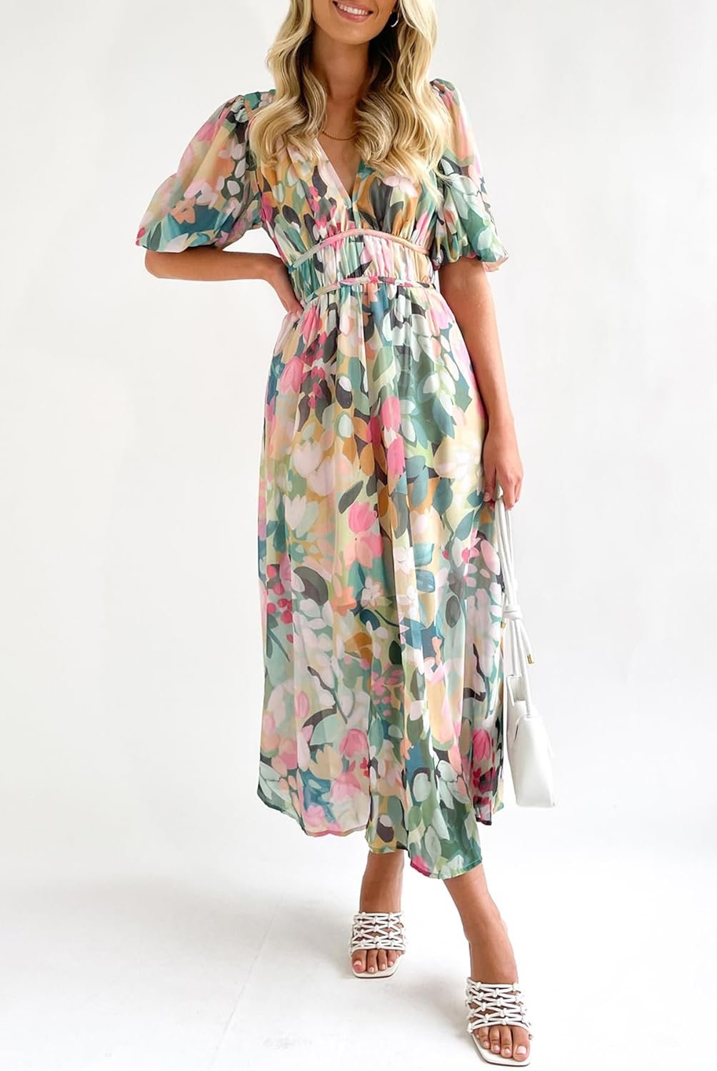 Featuring a V-neckline and elastic waist, this elegant dress combines a stunning floral print. It’s versatile enough for vacations, garden parties, or casual.