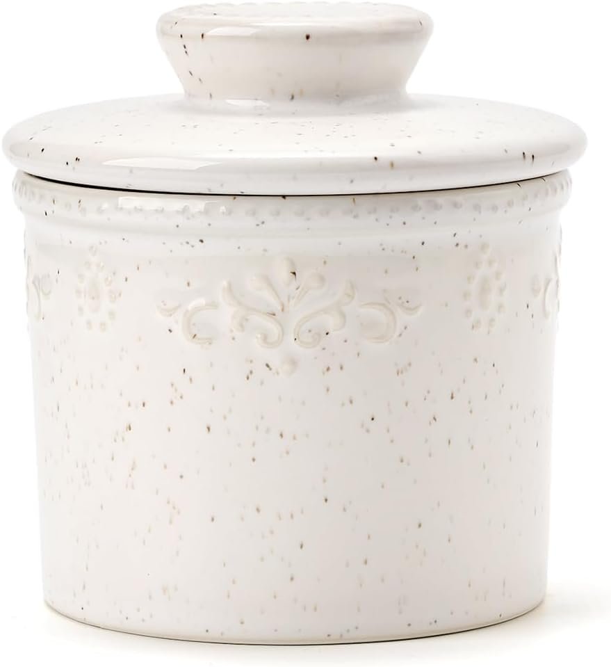 Customers find the butter dish visually appealing, with one noting the detailed top design, and appreciate its quality and functionality. The dish keeps butter fresh and soft for weeks without mold, and one customer mentions it stays fresh on the counter for weeks without refrigeration. They like its perfect color and sturdy construction, though opinions about size are mixed, with some finding it perfect while others say it’s smaller than expected.