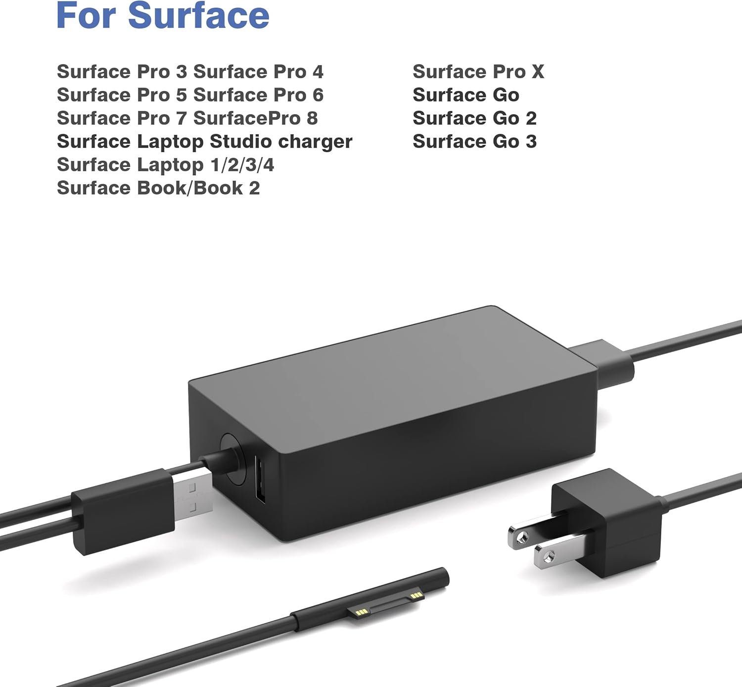 Compatible with Surface Pro Surface Pro 3, Surface Pro 4, Surface Pro 5, Surface Pro 6, Surface Pro 7, Surface Pro 7+, Surface Pro 8, Surface Pro 9, Surface Pro 10, Surface Pro X; Compatible with Surface Laptop Surface Laptop 1, Surface Laptop 2, Surface Laptop 3, Surface Laptop 4, Surface Laptop 5, Surface Laptop 6; Compatible with Surface Book Surface Book/Book 2/Book 3; Compatible with Surface Go Surface Go, Surface Go 2, Surface Go 3; Compatible with Surface Laptop Studio charger.