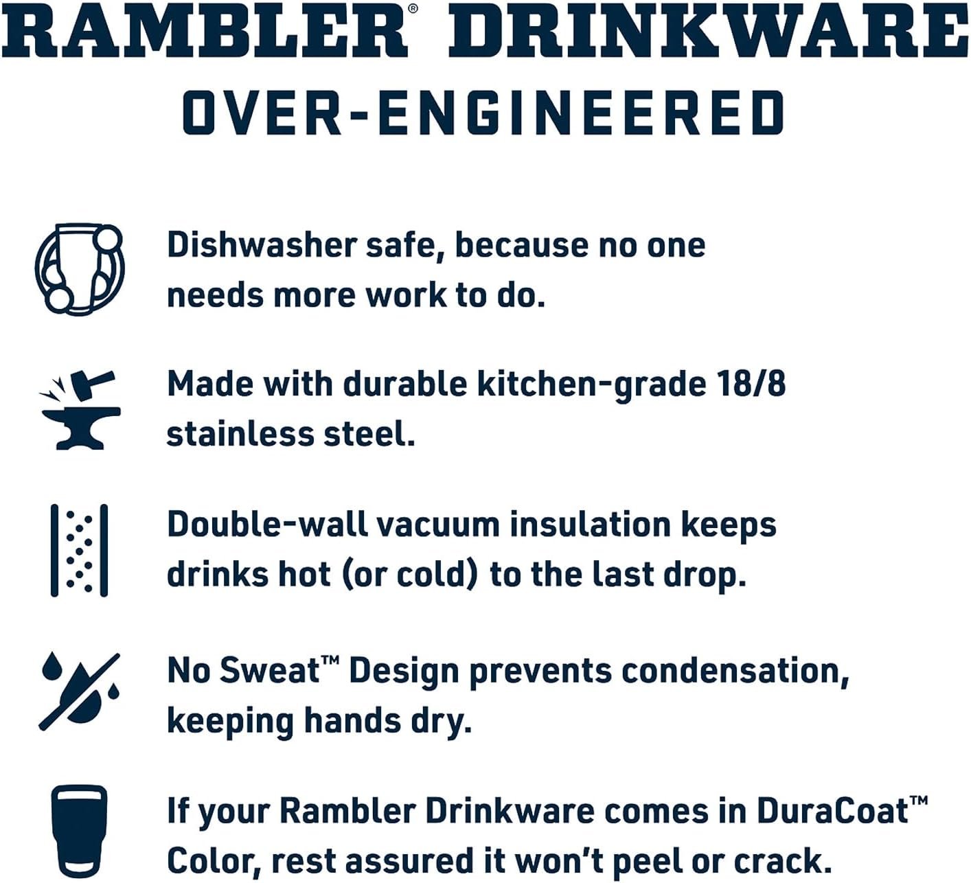 YETI Ramblers are BPA-free, dishwasher safe, and have a No Sweat Design to make sure your hands stay dry. The tough Duracoat coating on the colored tumblers won’t crack, peel or fade