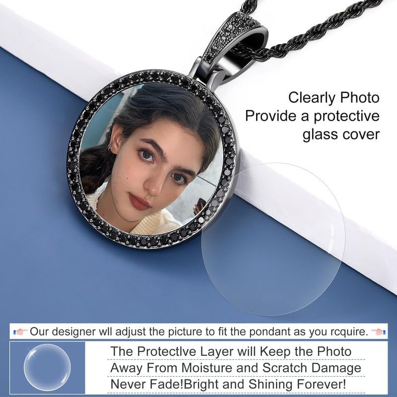 We have various kinds of picture pendant to satisfy different meets/purpose, including circle round pendant, Crystal Pendant with Big Cuban Chain, angel wings necklace With Tennis Chain, heart pendant, double sided pendant, rip pendnat,big oversided pendant. The memorial necklace come with gift box.