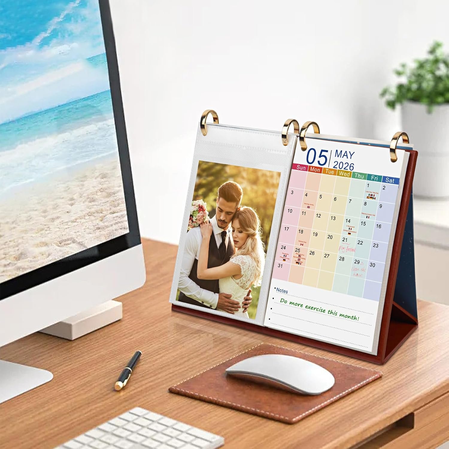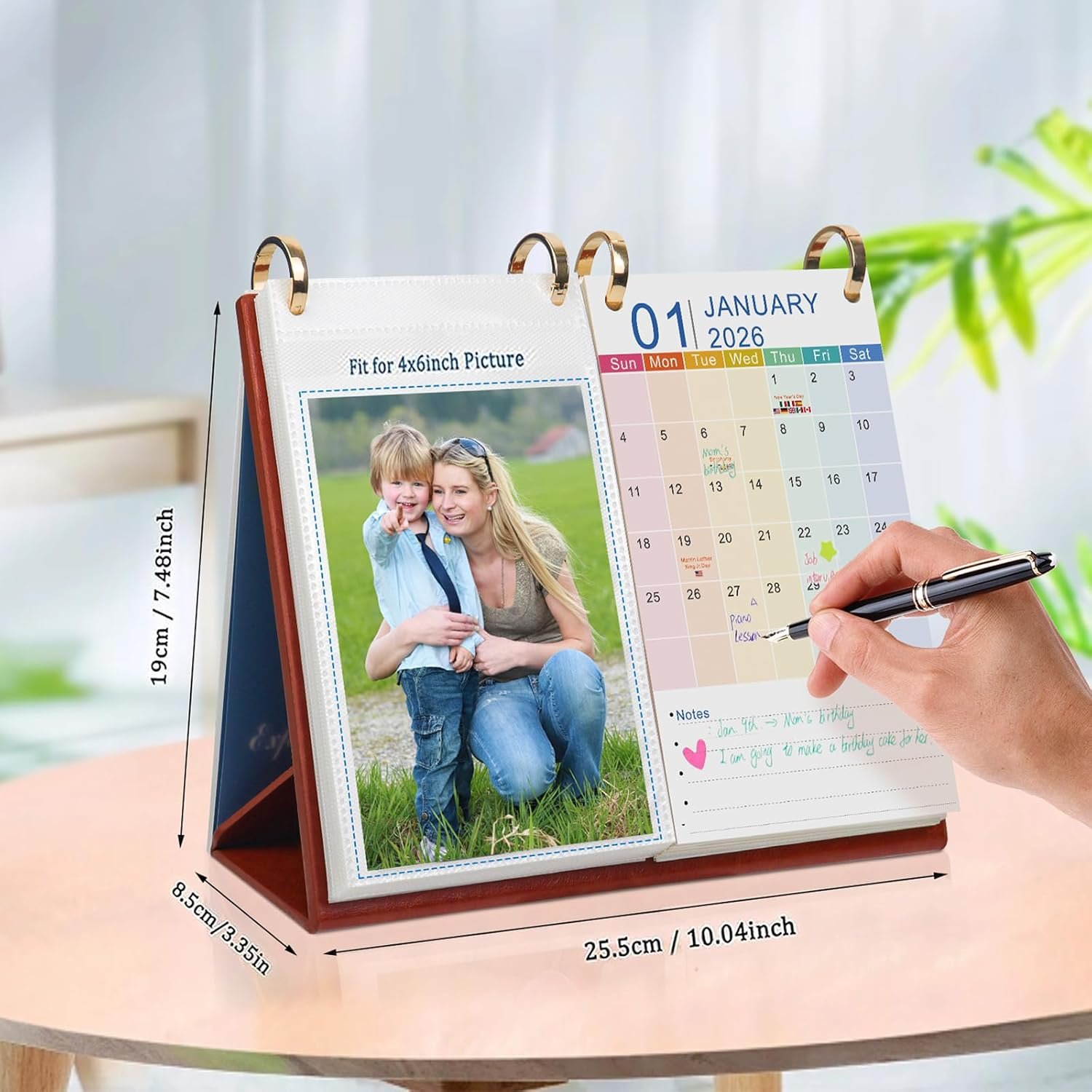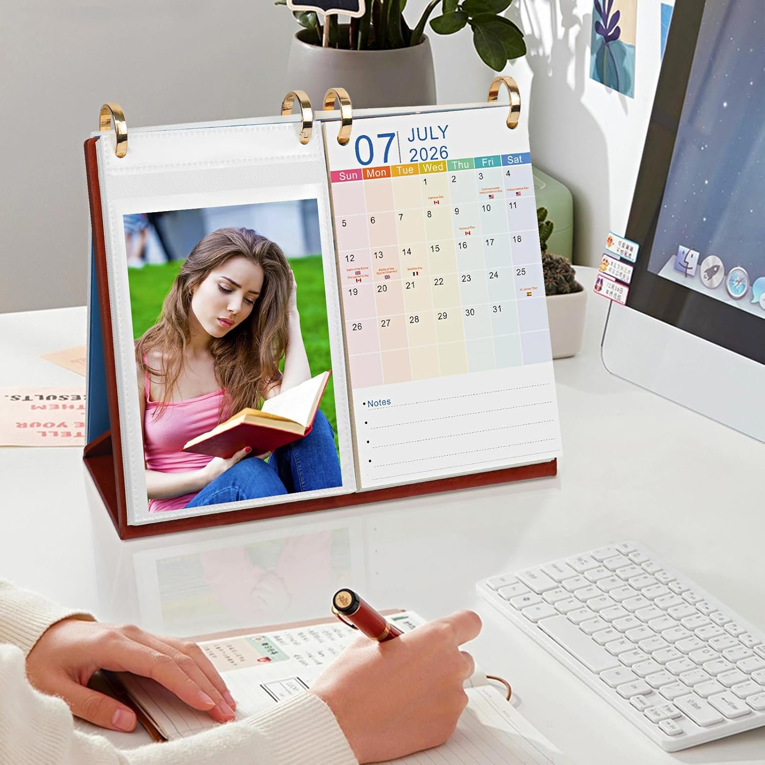 📆 Innovative Design: This desktop calendar album combines the functionality of a desktop photo album and a small calendar; it features plastic sleeves for convenient insertion of 4×6 photos. On the other side, you’ll find a calendar displaying dates from January 2026 to June 2027. You can showcase your cherished photos while flipping through the calendar.