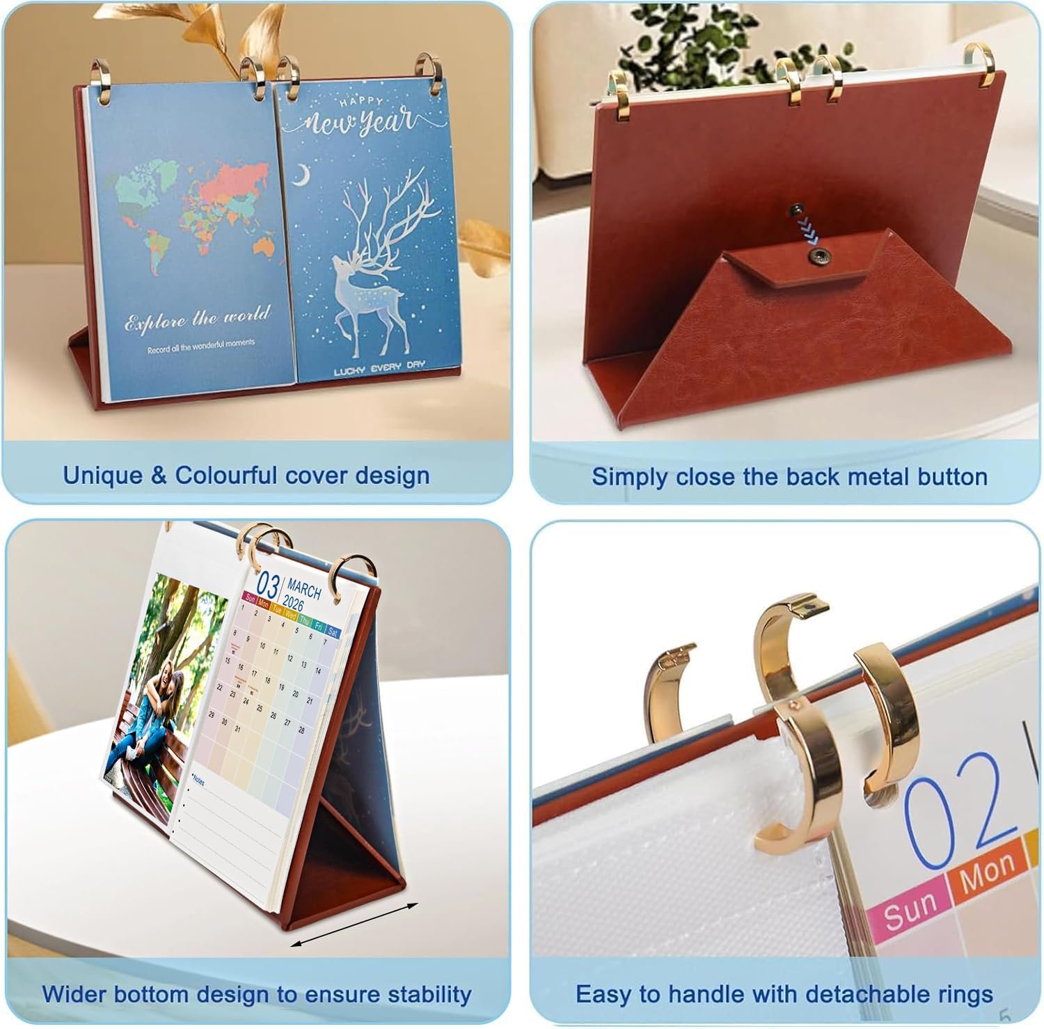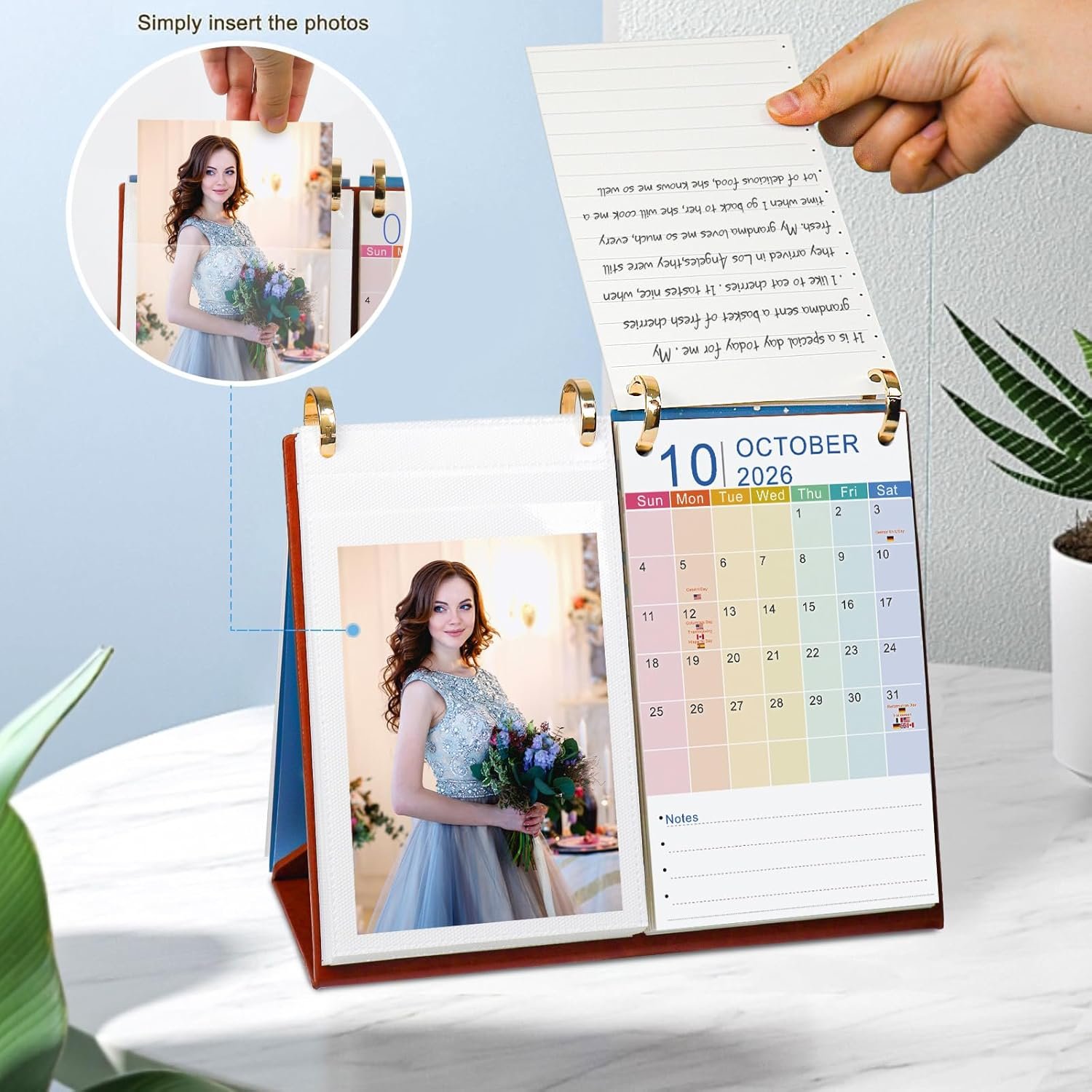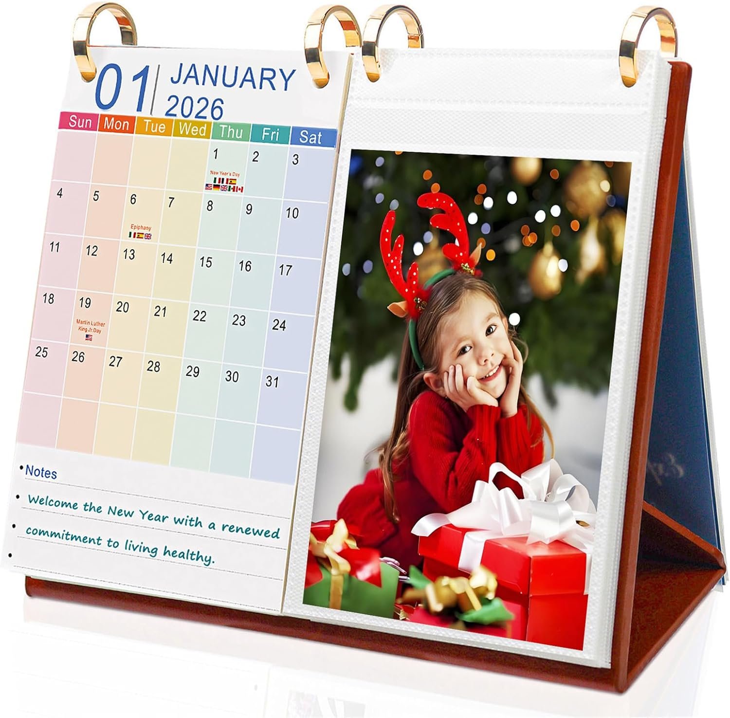 📆 Innovative Design: This desktop calendar album combines the functionality of a desktop photo album and a small calendar; it features plastic sleeves for convenient insertion of 4×6 photos. On the other side, you’ll find a calendar displaying dates from January 2026 to June 2027. You can showcase your cherished photos while flipping through the calendar.