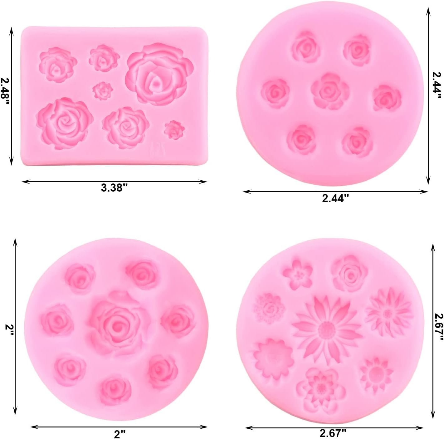 Product DescriptionTop Quality MaterialRose Cake Decoration Mold, made with top quality food grade silicone material.which is easy to demold and clean, also more durable to use.and it can tolerate high temperature range from -40℃ to 230℃.Size:4 pcs different Rose silicone molds1Pcs Rose fondant mold :2.48*3.38 inch1Pcs Rose candy fondant mold :2.44 *2.44 inch1Pcs Rose chocolate fondant mold :2.00 *2.00 inch1Pcs Rose Daisy Orchid fondant mold :2.67 *2.67 inchRose Daisy Orchid Cake Topper Decoration MoldsPrefect for Cake Decoration, Fondant, Chocolate, Cookies, Muffin Cupcake, Candy, Gum Paste , Pudding, Resin Clay MoldsNOTES1. Before first using, please wash with water to remove surface dust.2. Don’t use on open flames or over a direct heat source.3. Don’t pull and impact it violently or scratch it with sharp things.4. In order to avoid the dust, don’t directly exposure it to the air for a long time.5. When baking, it’ s better to put the mold in the flat baking tray as the silicone mold is soft.About ZiXiangWe working for silicone molds and other home kitchen supplements for many years.We are striving to make high quality products and provide sincere service to every our customers.